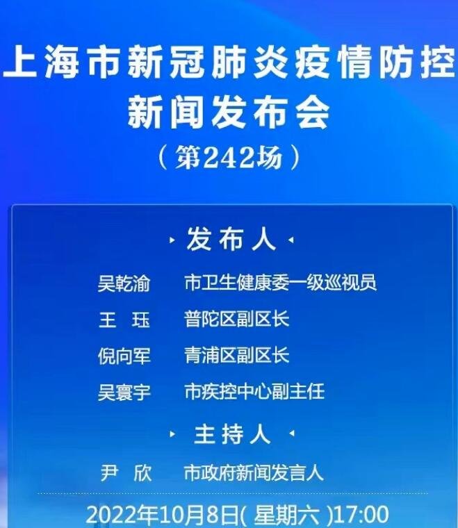 2022年10月8日17:00,上海市政府新闻办公室组织召开上海市新冠肺炎疫情防控工作第242场新闻发布会。市卫生健康委一级巡视员吴乾渝、普陀区副区长王珏、青浦区副区长倪向军、市疾控中心副主任吴寰宇出席,介绍有关情况,并回答提问。市政府新闻发言人尹欣主持新闻发布会。