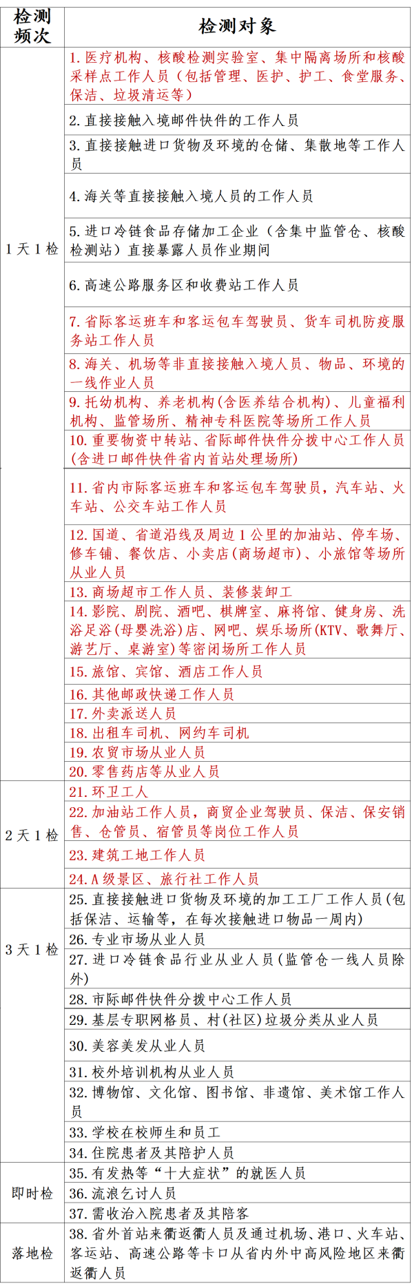 它重点人群检测频次仍按原要求执行,调整后的重点人群检测频次要求详见附件,本文件规定暂执行至10月31日,后续视情研判调整。全市一般人群常态化核酸检测的频次仍保持3天一次。对未按规定频次检测的重点人群和一般人群,衢通码予以赋黄码提醒。