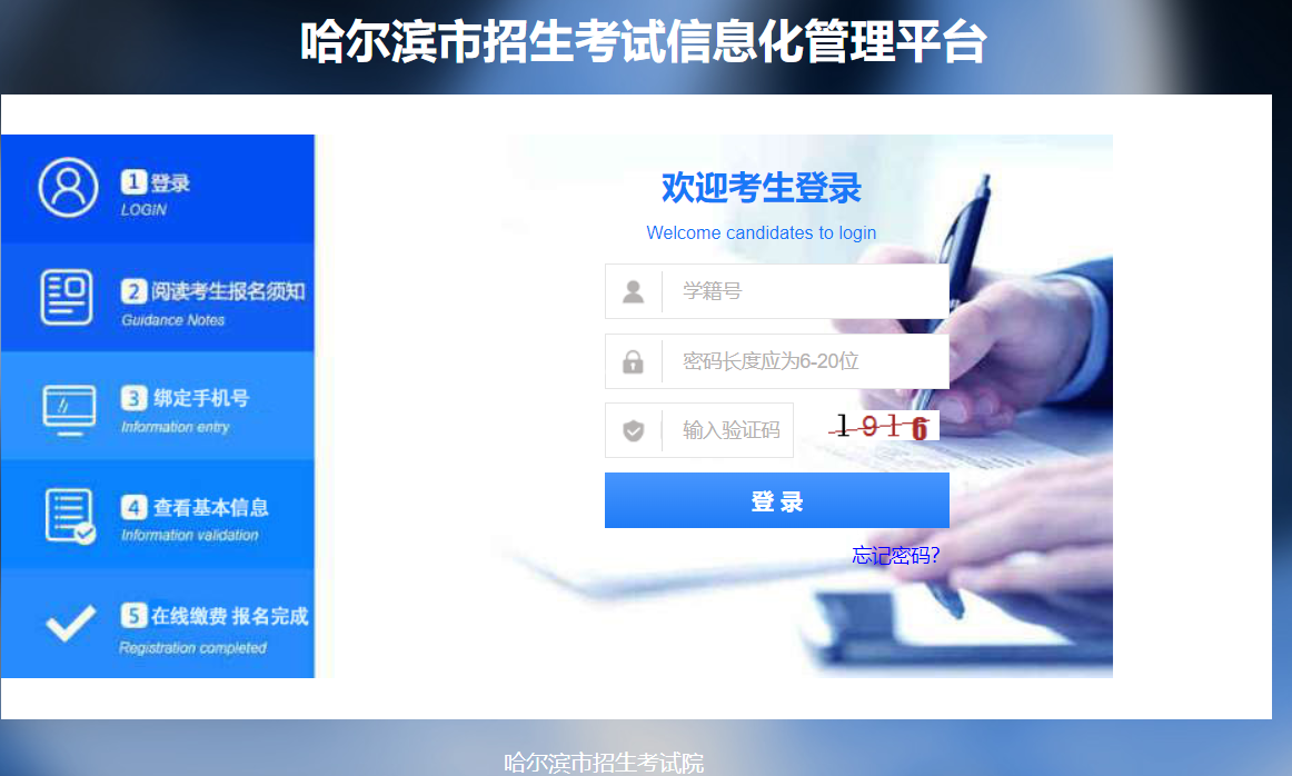 第一步:进入哈尔滨市招生考试信息化管理平台https://zk.hrbeduy.com/studentuser/login