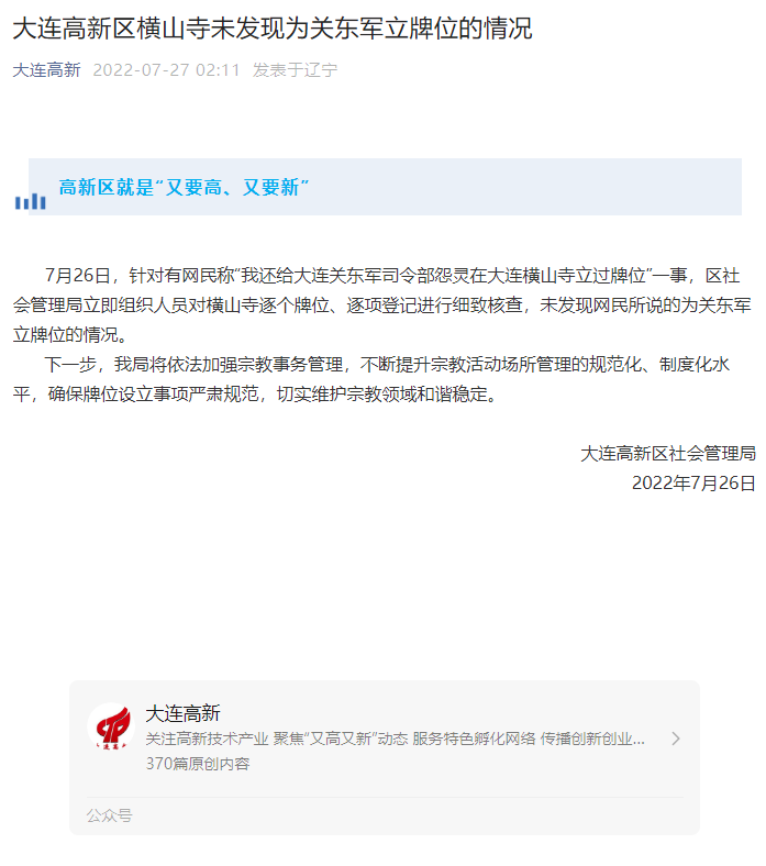 7月26日,针对有网民称“我还给大连关东军司令部怨灵在大连横山寺立过牌位”一事,区社会管理局立即组织人员对横山寺逐个牌位、逐项登记进行细致核查,未发现网民所说的为关东军立牌位的情况。