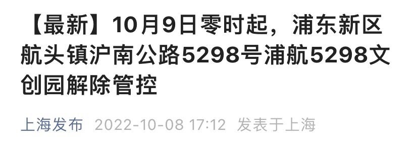 上海市新冠肺炎疫情防控工作领导小组办公室发布消息:根据《新型冠状病毒肺炎防控方案》相关规定,经市新冠肺炎疫情防控工作领导小组办公室研究决定,自2022年10月9日零时起,将浦东新区航头镇沪南公路5298号浦航5298文创园解除管控。