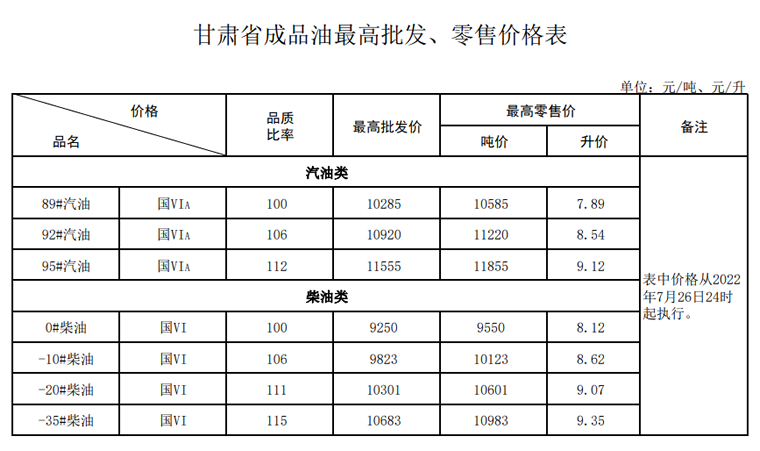 自2022年7月26日24时起,甘肃省汽、柴油标准品价格分别下调300元和290元。调整后的各牌号汽、柴油最高批发、零售价格见附表。