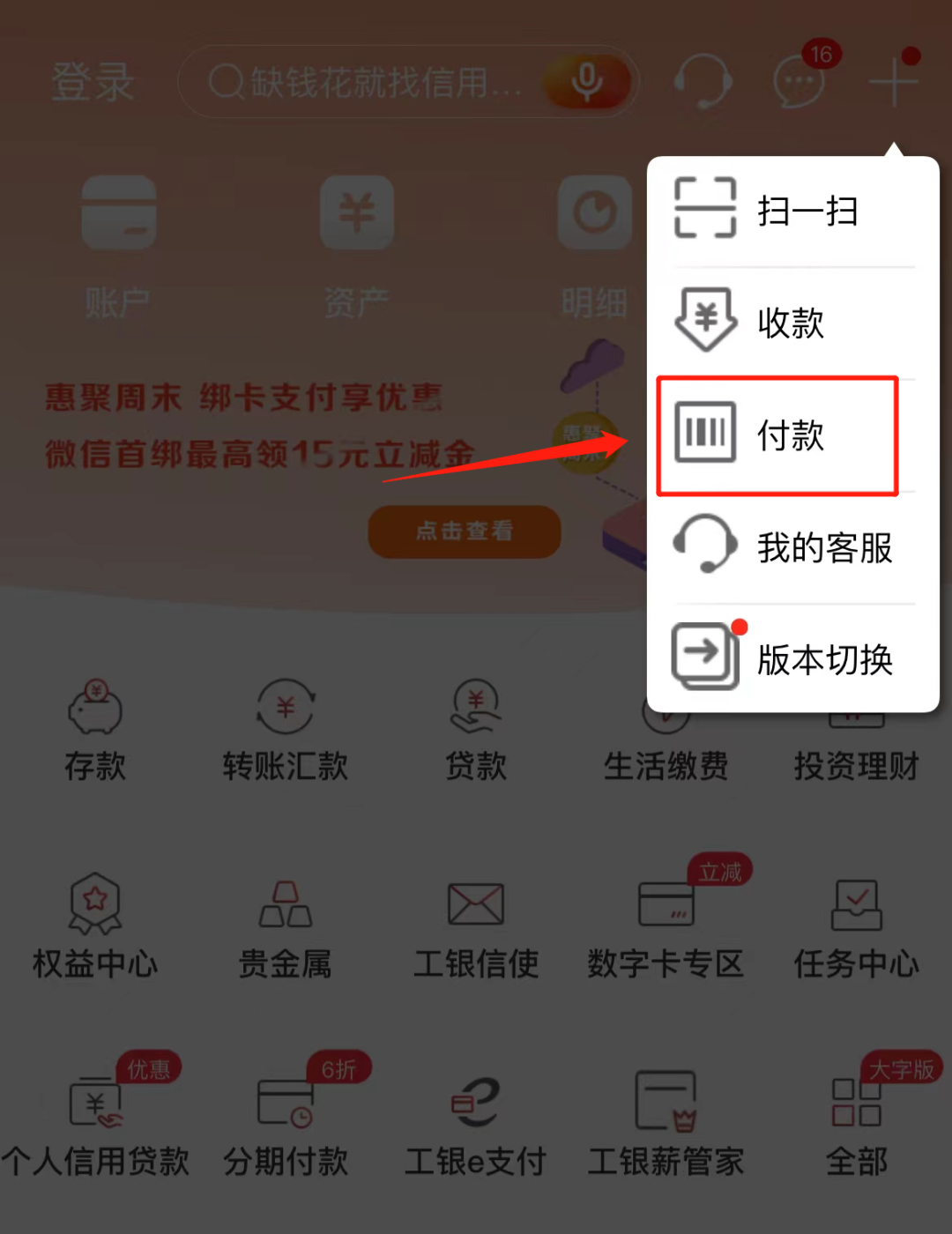 2、登录成功后,点击右上方“+”按钮,选择付款选项;