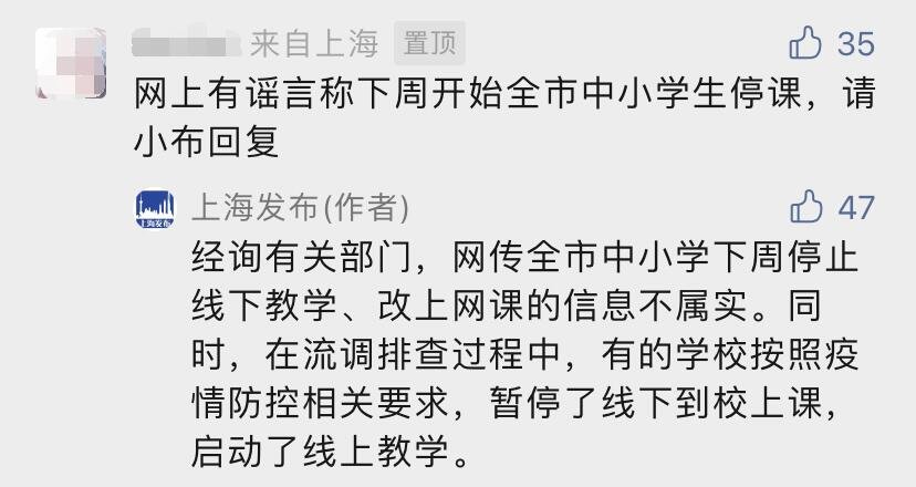 近期,上海新增病例数据有所增加,网传全市中小学将停课。对此,有网友至上海发布留言区咨询,2022年10月9日,上海发布官方回应如下:↓↓