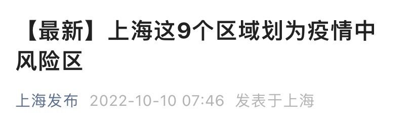 2022年10月10日,上海市新冠肺炎疫情防控工作领导小组办公室发布消息:根据《新型冠状病毒肺炎防控方案(第九版)》要求,经研究决定,调整本市以下区域风险等级(具体时间根据相关区域按照国家要求落实相应管控措施起计算):