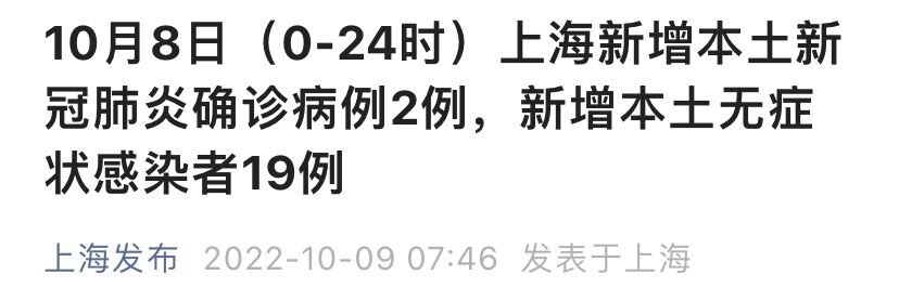 上海市卫健委10月9日通报:2022年10月8日0—24时,新增本土新冠肺炎确诊病例2例和无症状感染者19例,其中1例确诊病例和18例无症状感染者在隔离管控中发现,详情如下。