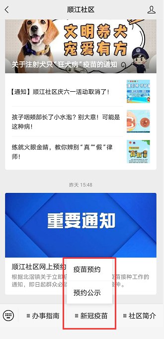 为方便广大居民预约登记新冠疫苗接种,顺江社区公众号每天16点推出预约登记号(额满即止),但由于疫苗厂家、疫苗数量未定,报名后一切以顺江社区公众号“预约公示”信息栏为准。