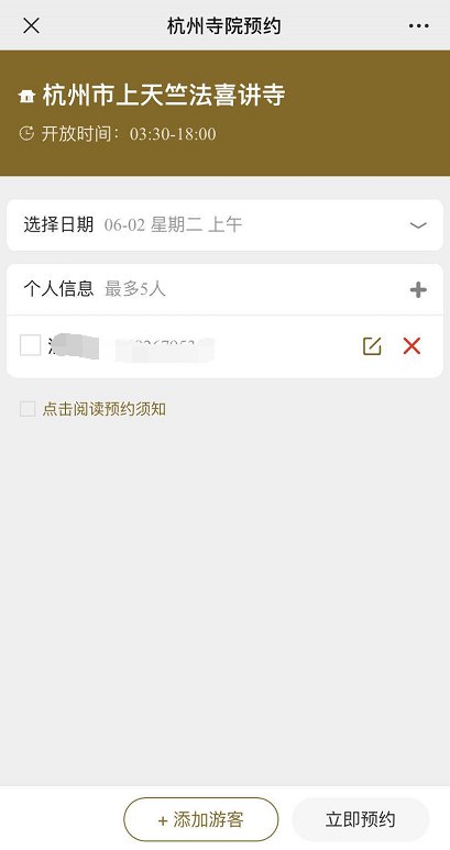通过“杭州寺院参观预约平台”微信公众号进行预约。