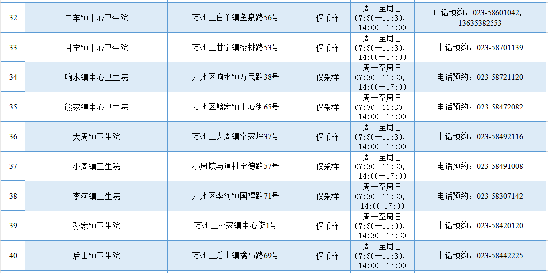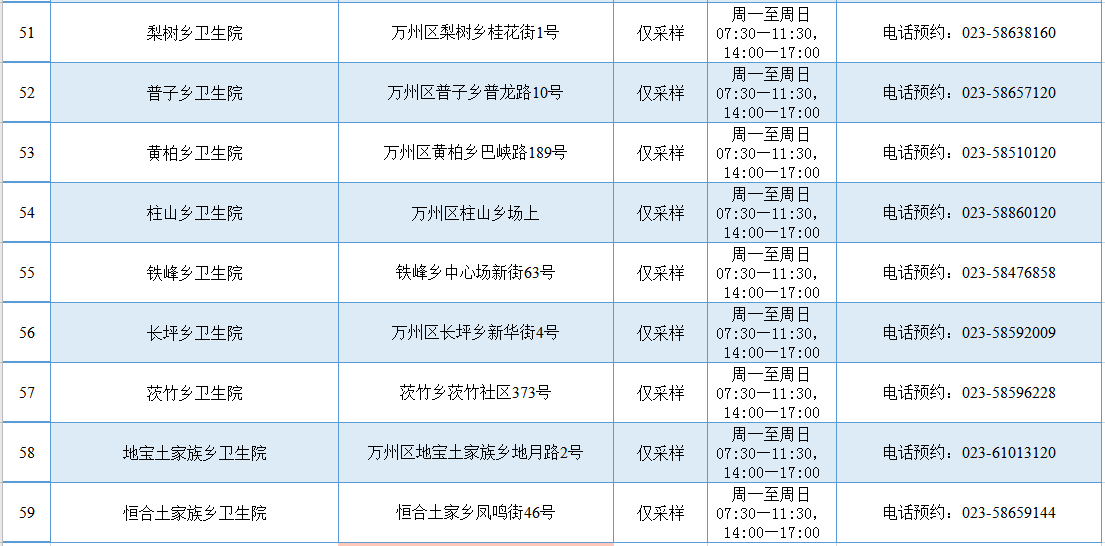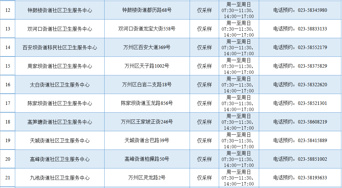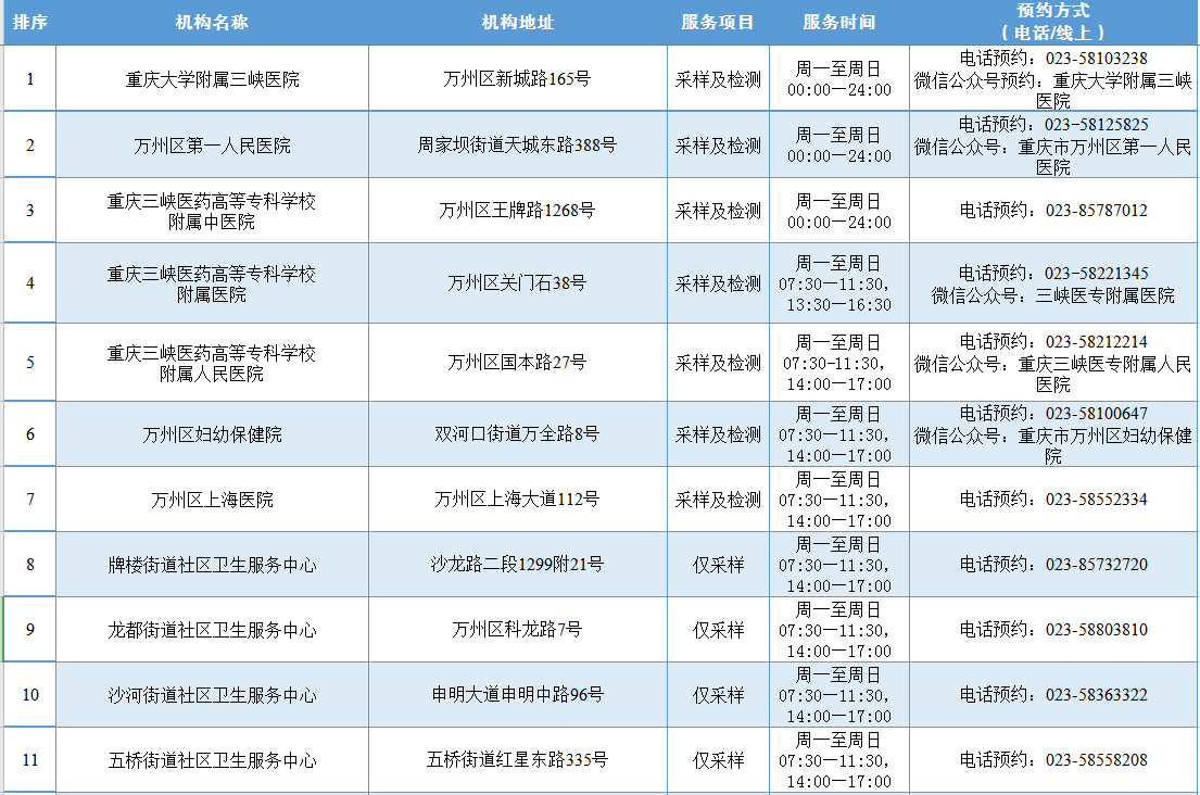 全区各新冠病毒核酸采样点服务时间调整为每日7:30—11:30,14:00—17:00(重庆大学附属三峡医院、万州区第一人民医院、重庆三峡医药高等专科学校附属中医院可以24小时开展核酸采样及检测服务)。后期采样点服务时间如有调整,将另行通知。