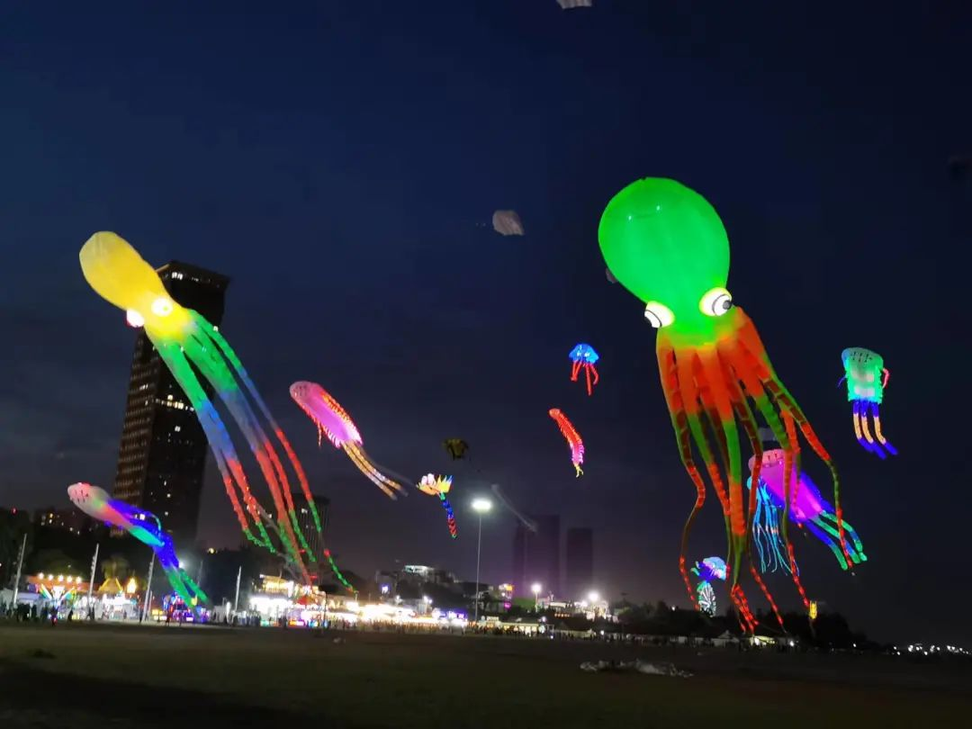 各式造型新颖、光彩夺目的夜光风筝,将在现场群众的欢呼喝彩声中缓缓升空,翩翩飞舞的夜光风筝为游客带来了一场风筝视觉的艺术盛宴。