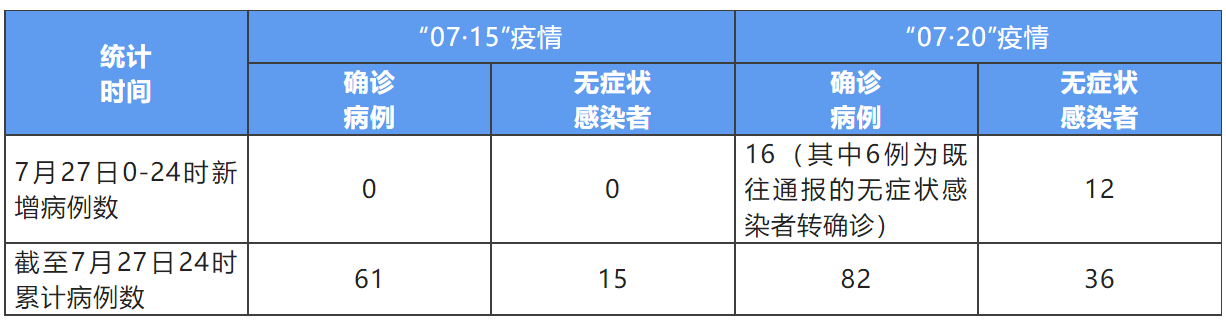“07·20”疫情新增本土确诊病例16例(其中6例为既往通报的无症状感染者转确诊),新增本土无症状感染者12例。截至27日24时,本起疫情累计报告本土确诊病例82例,本土无症状感染者36例。