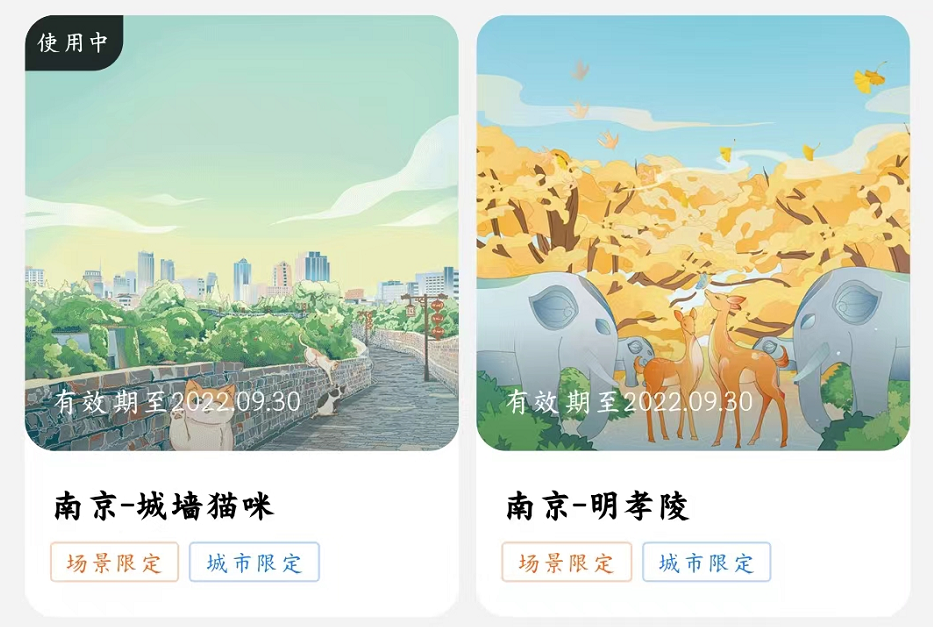 除此之外,还可在活动页面每日随机抽取两款城市名片出行皮肤。这是由支付宝联名中国国家地理景观推出的“城市名片”系列,结合中国国家地理·景观的地标作品推出了具有城市文化特色的出行皮肤,用户所获得的皮肤权益将展示在“支付宝”—“出行”—“管理”—“出行皮肤管理”内。