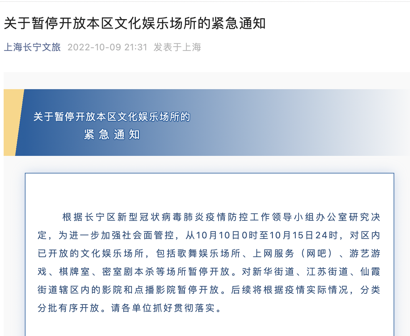根据长宁区新型冠状病毒肺炎疫情防控工作领导小组办公室研究决定,为进一步加强社会面管控,从10月10日0时至10月15日24时,对区内已开放的文化娱乐场所,包括歌舞娱乐场所、上网服务(网吧)、游艺游戏、棋牌室、密室剧本杀等场所暂停开放。对新华街道、江苏街道、仙霞街道辖区内的影院和点播影院暂停开放。后续将根据疫情实际情况,分类分批有序开放。请各单位抓好贯彻落实。