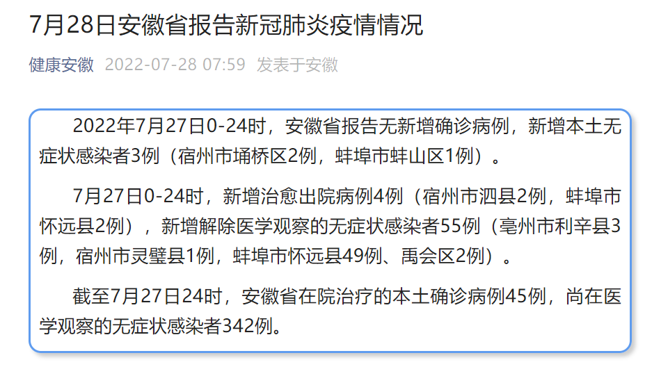 2022年7月27日0-24时,安徽省报告无新增确诊病例,新增本土无症状感染者3例(宿州市埇桥区2例,蚌埠市蚌山区1例)。