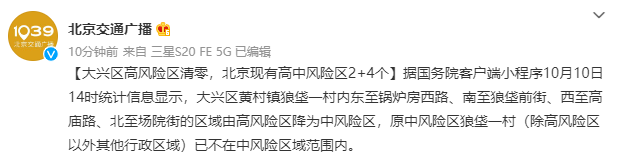 据国务院客户端小程序10月10日14时统计信息显示,大兴区黄村镇狼垡一村内东至锅炉房西路、南至狼垡前街、西至高庙路、北至场院街的区域由高风险区降为中风险区,原中风险区狼垡一村(除高风险区以外其他行政区域)已不在中风险区域范围内。
