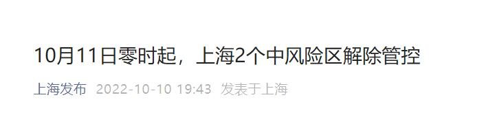 上海市新冠肺炎疫情防控工作领导小组办公室发布消息:根据《新型冠状病毒肺炎防控方案(第九版)》要求,经研究决定,自2022年10月11日零时起,将以下2个中风险区解除管控: