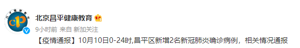10月10日0-24时,昌平区新增2名新冠肺炎确诊病例,相关情况通报: