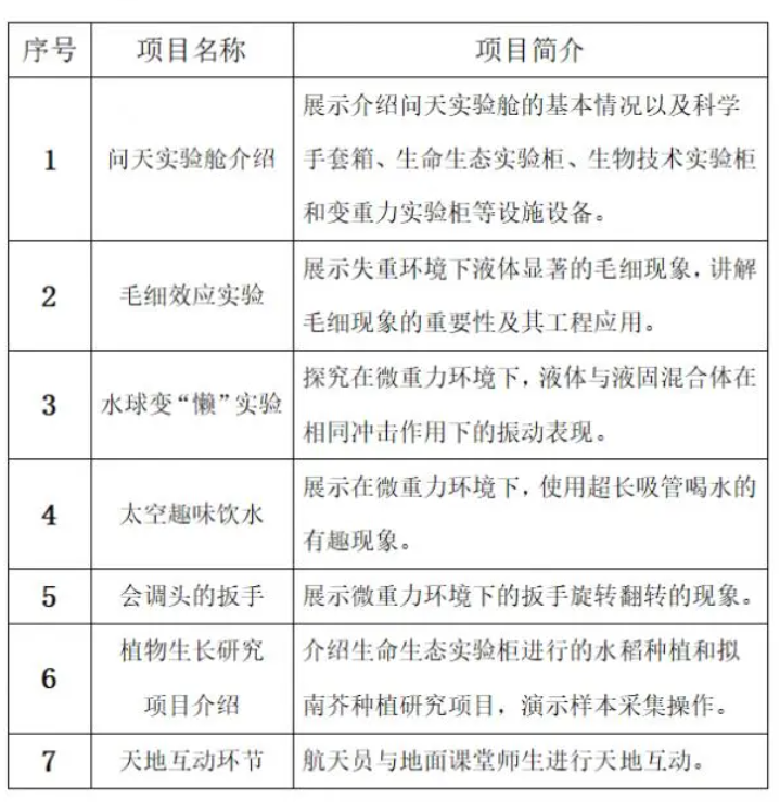 本次太空授课活动将继续采取天地互动方式进行,3名航天员将在轨介绍展示中国空间站问天实验舱工作生活场景,演示微重力环境下毛细效应实验、水球变“懒”实验、太空趣味饮水、会调头的扳手以及植物生长研究项目介绍,并与地面课堂进行互动交流(授课内容介绍附后),旨在传播普及载人航天知识,激发广大青少年对科学的兴趣。