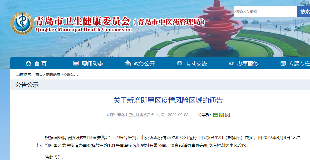 根据国务院联防联控机制有关规定,经综合研判,市委统筹疫情防控和经济运行工作领导小组(指挥部)决定,自2022年9月8日12时起,将即墨区龙泉街道办事处解放三路101号青岛宇远新材料有限公司、温泉街道办事处东杨戈庄村划为中风险区。