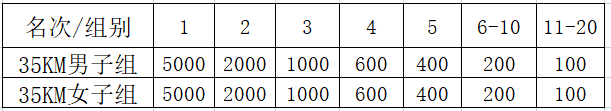 1、:按枪响成绩排名,35km组男、女各前20名税前奖金(人民币)见下表: