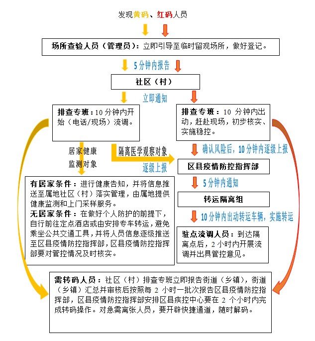 场所防疫工作人员通过查验场所码或主动报告等方式发现红黄码人员后,立即引导至临时留观场所临时管控,做好登记,并报告本单位或场所的场所码管理员,场所码管理员要在5分钟以内报告社区(村)或景区景点排查专班(以下简称“排查专班”)。