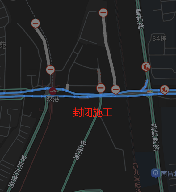 二、封闭施工期间,机动车可经双港东大街——皇姑路——方志敏大道——庐山中大道——双港东大街通行。