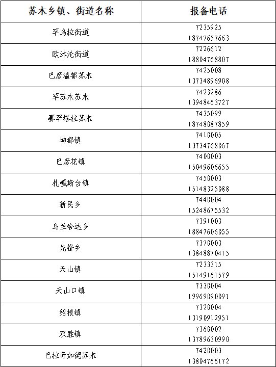 请各位家长通过微信、电话报备等方式即刻与所在苏木乡镇、街道联系。16个苏木乡镇、街道报备电话如下: