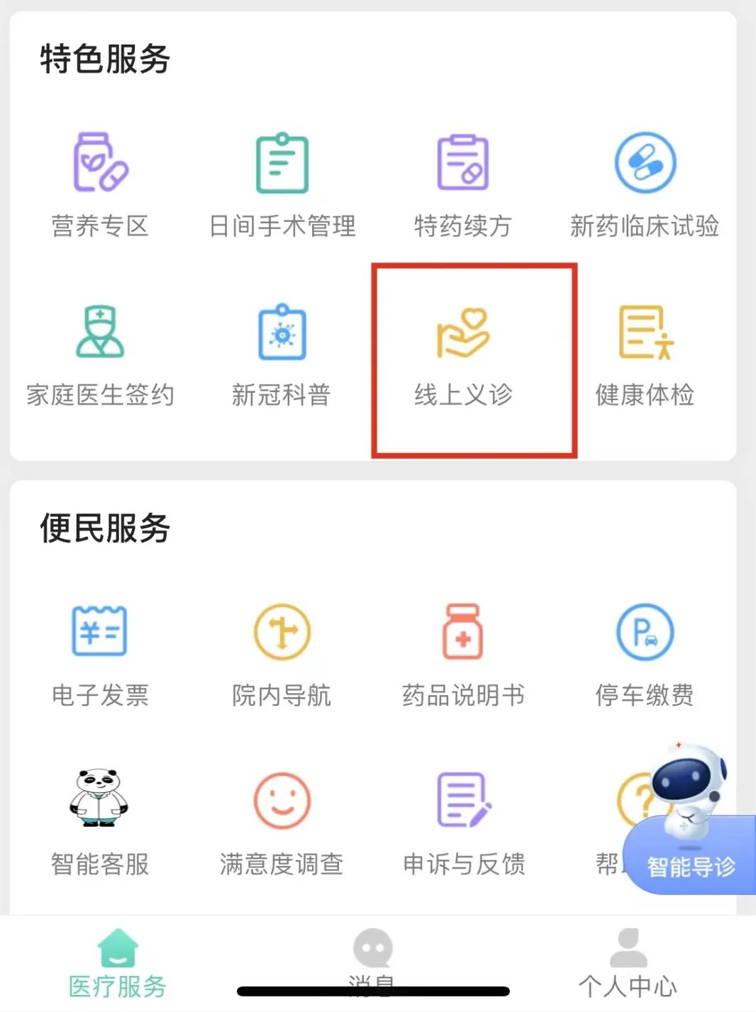 02登录“四川大学华西医院”微信公众号或“华医通”APP,主页中选择“线上义诊”进入。