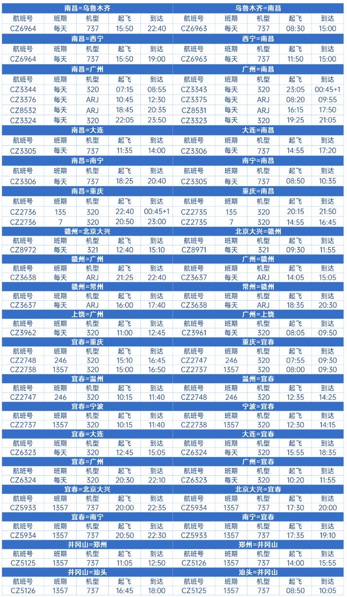 ➤中国南方航空江西各机场航班时刻表(2022年冬航季):