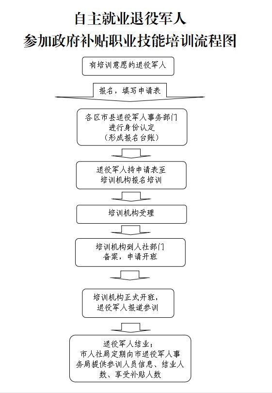 有参训意愿的退役军人,携带1张2寸免冠照片及退役证件,到区市县退役军人事务部门选定培训机构和培训项目并进行身份认定,填写《培训申请表》(附件1)。参训退役军人可持申请表及退役证件自行前往培训机构报名参训。详细流程可咨询区市县退役军人事务部门。