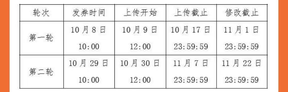 12:00后开始上传资料,须在领券后10天内(截至11月7日)进行购车资料上传(至少包含身份证正反面、全额购车发票),并于领券后25天内(截至11月22日)完成资料补充、修改。具体时间进度见下表。