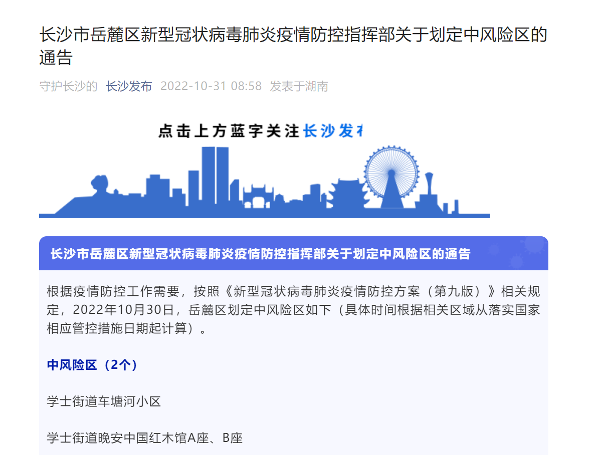 根据疫情防控工作需要,按照《新型冠状病毒肺炎疫情防控方案(第九版)》相关规定,2022年10月30日,岳麓区划定中风险区如下(具体时间根据相关区域从落实国家相应管控措施日期起计算)。
