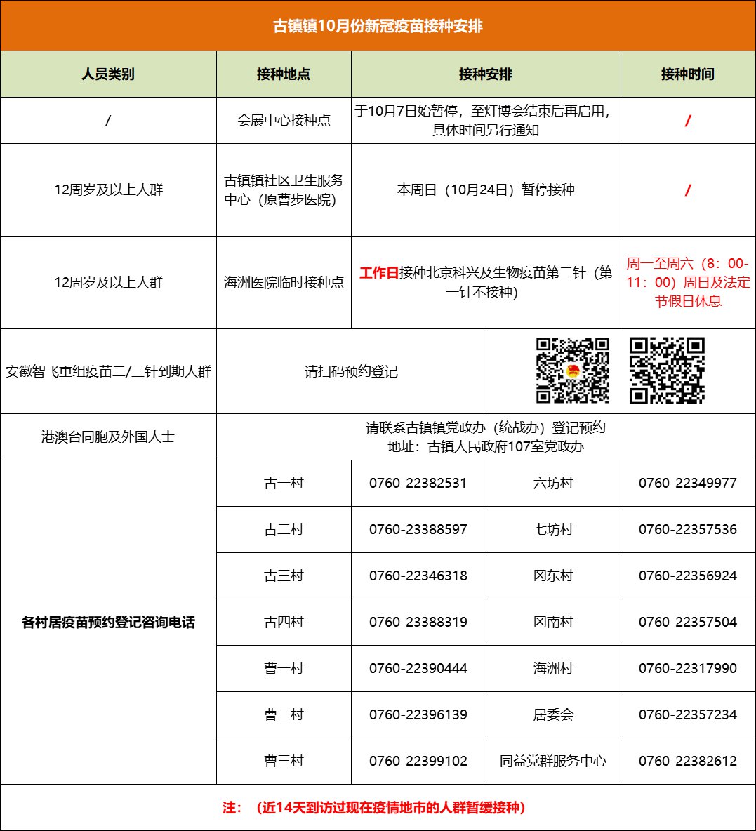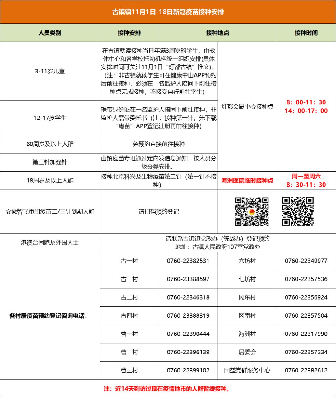 为进一步强化新冠疫苗加强免疫接种,方便群众,我镇从11月18日起古镇会展中心新冠疫苗接种时间进行调整,具体接种时间如下: