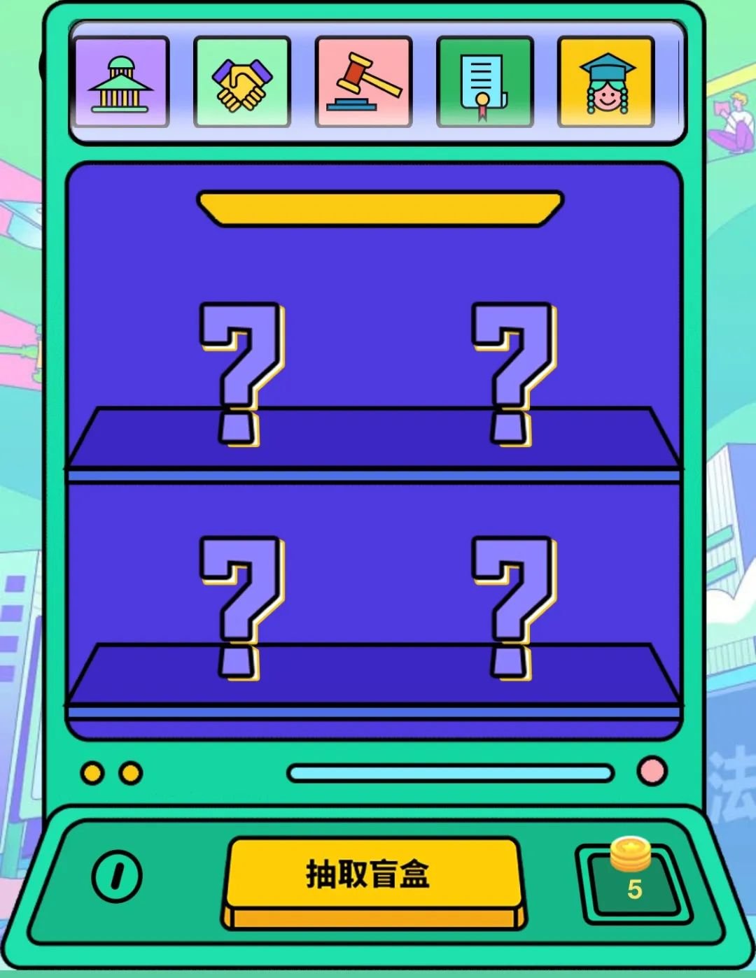 知识竞答为盲盒抽取形式,每次抽取消耗1枚硬币。1次可抽出5个盲盒。