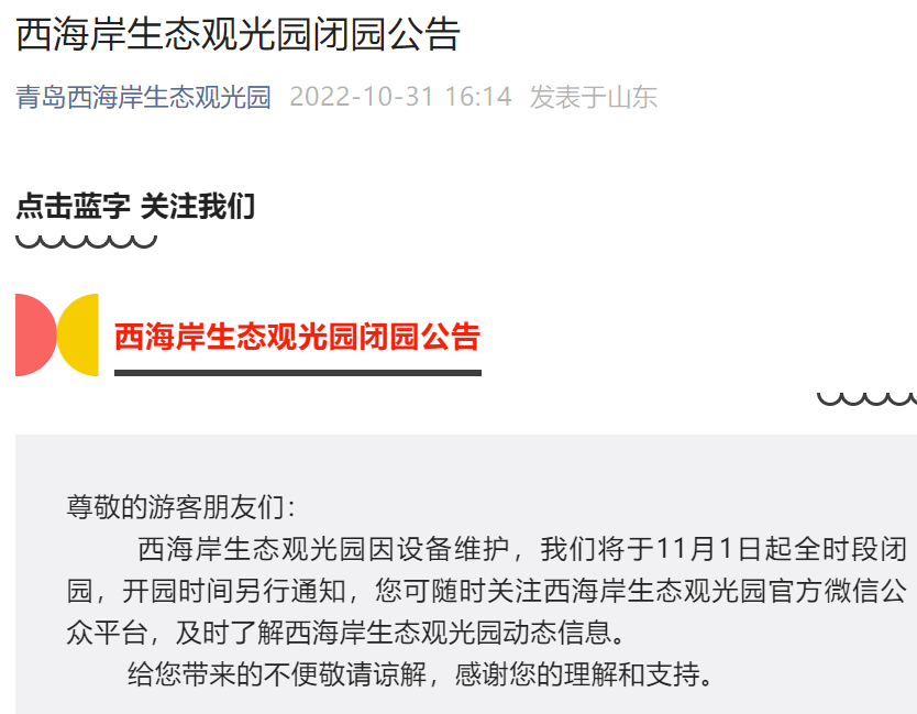 2022青岛西海岸生态观光园闭园公告 2022青岛西海岸生态观光园闭园公告图片