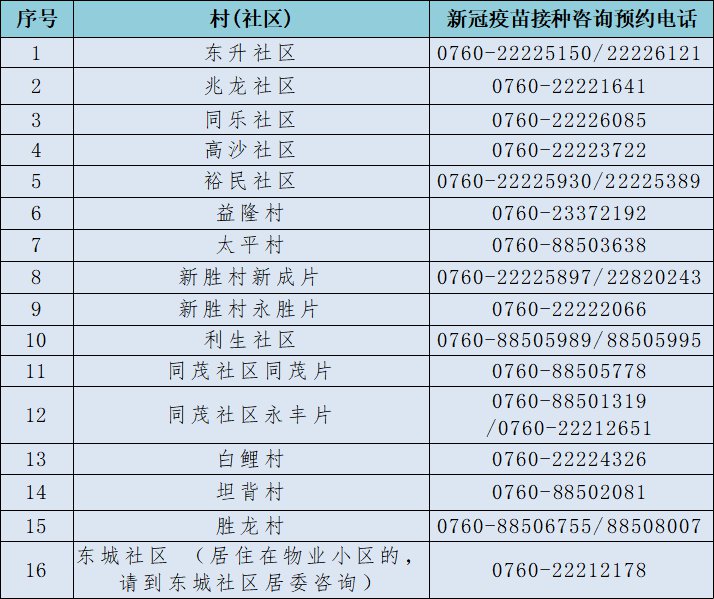 东升镇各村(社区)新冠疫苗接种咨询预约电话