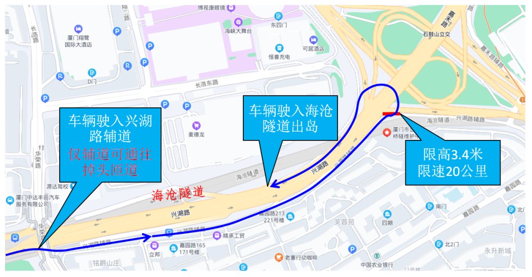 10月27日起,湖里区石鼓山立交往海沧隧道掉头匝道开放通行,该通道仅允许通往海沧隧道车辆通行,同时限高3.4米,无法满足车辆掉头前往兴湖路、长浩路的通行需求。