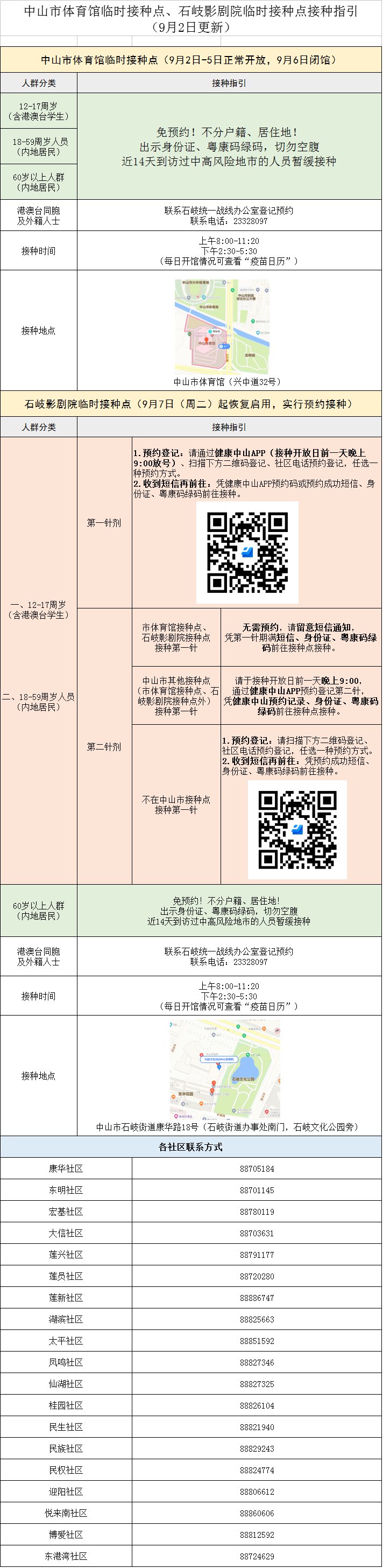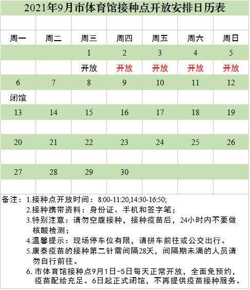 ◆中山市体育馆接种点9月1日-5日(8:00-11:20;14:30-16:50)每天正常开放,全面免预约,疫苗配给充足,欢迎市民朋友前往接种。6日起正式闭馆,不再提供疫苗接种服务。