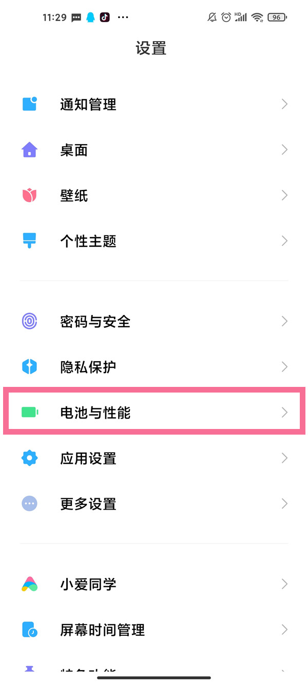 1、在手机设置菜单中点击【电池与性能】。