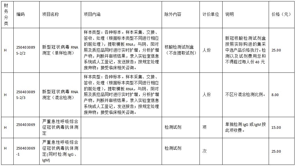 一、将“250403089S-2/2新型冠状病毒RNA测定(单样检测)”项目价格统一降至25元/人份,检测及试剂费用总和不得超过40元/人份;“250403089S-2/3新型冠状病毒RNA测定(混合检测)”项目价格统一降至8元/人份,不得收取其他费用;新冠病毒核酸(抗体)检测费用包括检测服务费和试剂盒费用,执行“250403069严重急性呼吸综合征冠状病毒抗体测定”,价格降至15元/项,同时检测IgG、IgM“250403069-1”项目价格降至25元/次。